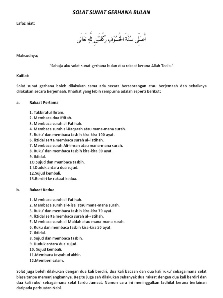 Pada rakaat berikutnya beliau mengerjakannya seperti rakaat pertama. KAIFIAT SOLAT SUNAT GERHANA BULANMATAHARI HUKUM SOLAT GERHANA Sunat Muakkad ةﺪـﻛﱠﺆ ﻣ CARA-CARA SOLAT Dua 2 rakaat sembahyang seperti sembahyang sunat yang lain. Cara Solat Sunat Gerhana Rencana ini mungkin perlu diwikikan untuk memenuhi mutu piawaian Wikipedia.