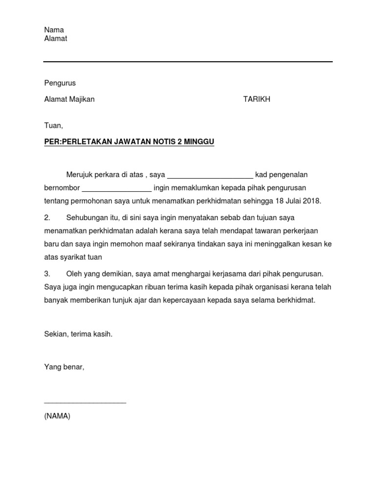 If you are author or own the copyright of this book please report to us by using this DMCA report form. Inilah Contoh Surat Berhenti Kerja 2 Minggu Pdf4 contoh surat letak jawatan ikut situasi notis 24 jam 2 minggu sebulan versi bm surat pengikut minggu. Contoh Surat Berhenti Kerja Satu Bulan Download Kumpulan Gambar.