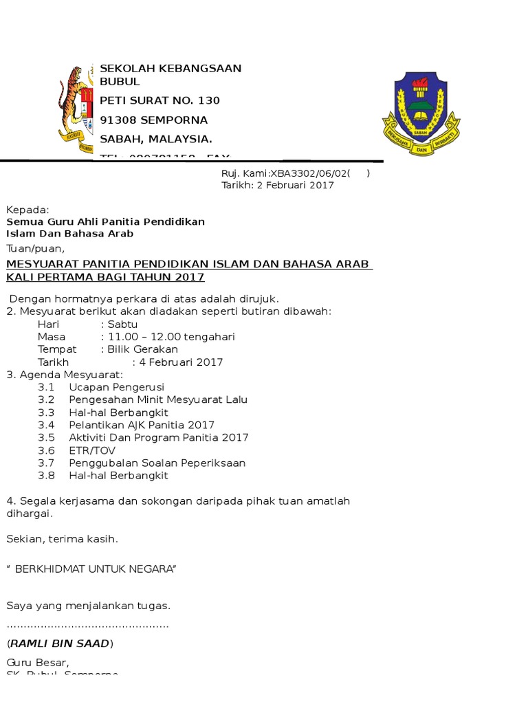Jawatankuasa Panitia Pendidikan Islam Tarikh. Pk07 1 Format Surat Panggilan Mesyuarat Plc 1 2018. Contoh surat panggilan mesyuarat panitia spsk harap harap contoh ini adalah betul.