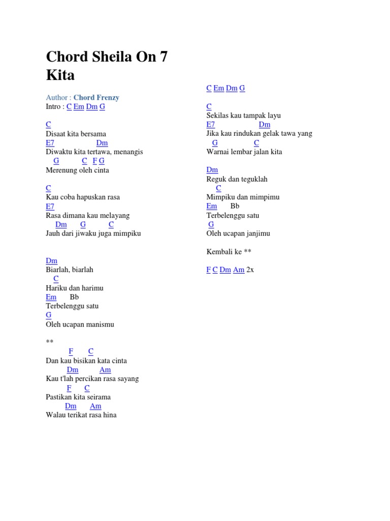 CHORD SHEILA ON 7 KITA. C Disaat kita bersama E7 Dm Diwaktu kita tertawa menangis G C F G Merenung oleh cinta C Kau coba hapuskan rasa E7. Ambilkan Bulan Chord Sheila On 7 - Tertatih Chord TERIMA KASIH ATAS KUNJUNGAN ANDA.